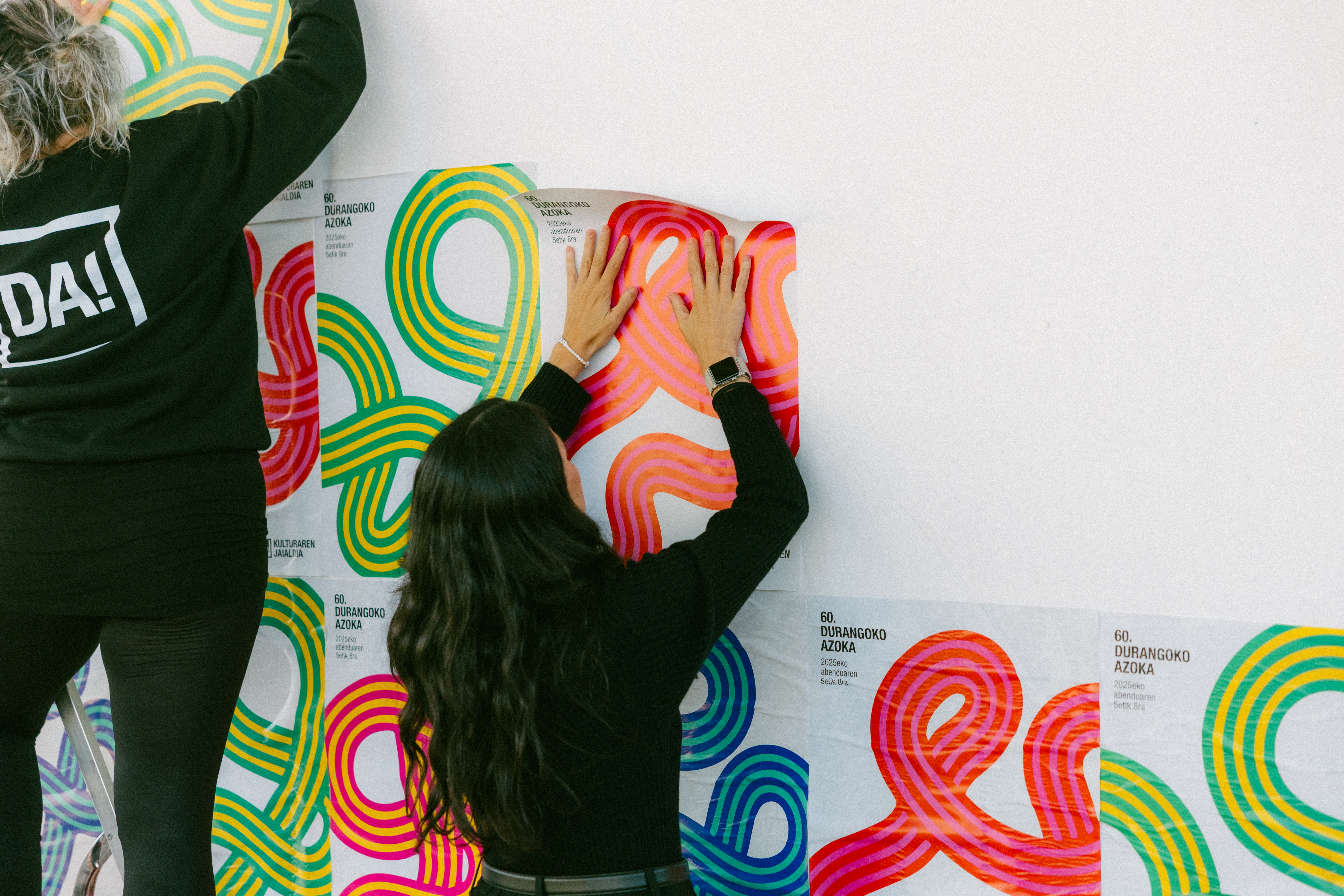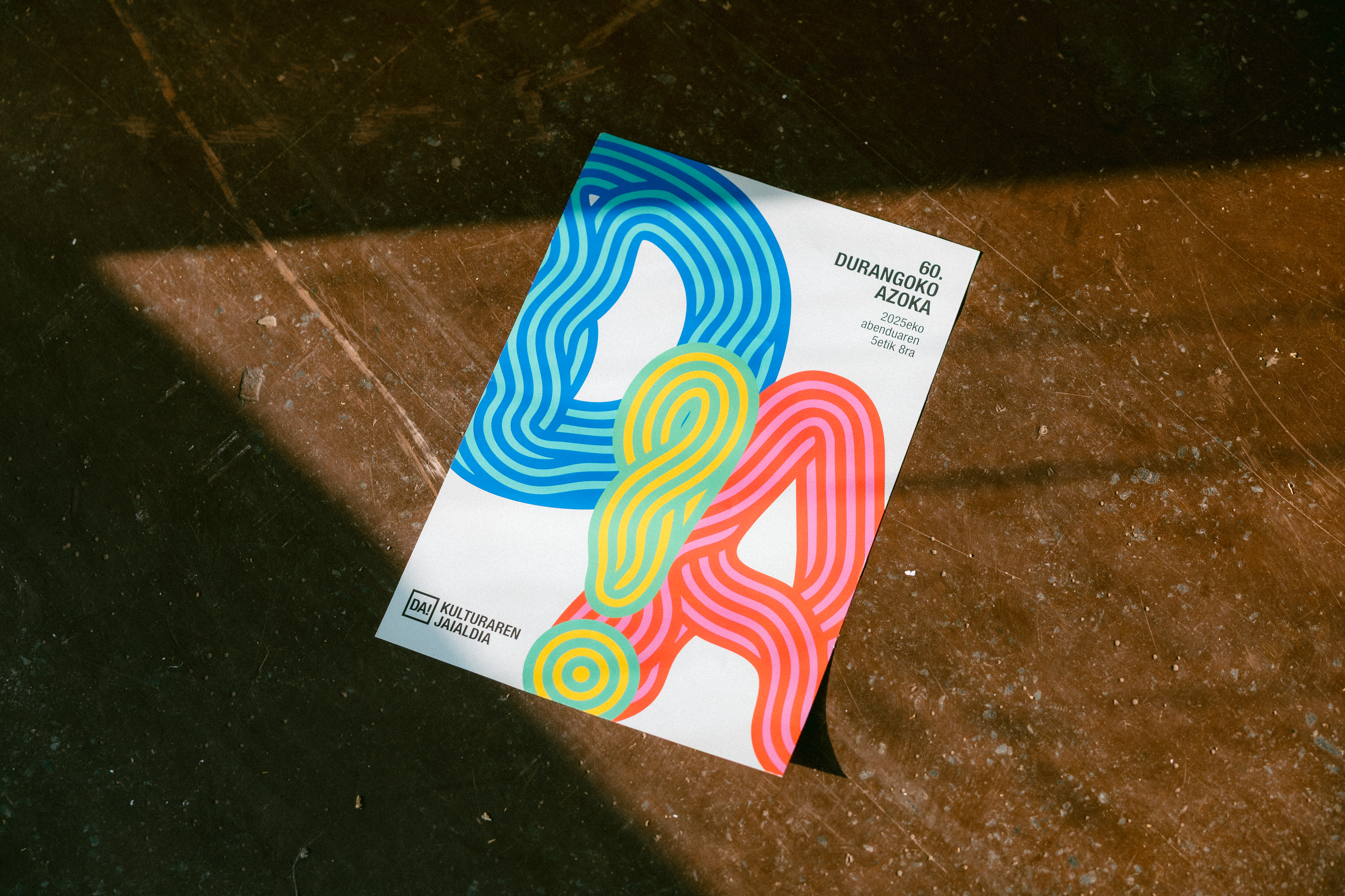 Durangoko Azoka no presenta un único cartel este año, “los presenta todos”. El diseño surgió de un número “60” dibujado a mano; pero era algo más que un número, formaba un recorrido, un movimiento, que representa tanto el camino recorrido como el que queda por recorrer”. Partiendo de esa base, cada cartel representa un modo de vivir la cultura: “Están formados por colores vivos, disciplinas diversas y formas irregulares, que reflejan la energía libre y el ambiente festivo de la Azoka”. Y es que Durangoko Azoka no es simplemente una “feria”. Es un festival de la cultura vasca. Un lugar en el que se celebra el euskara, se moldea y se comparte. “Como la propia lengua, Durangoko Azoka también está en constante movimiento. Cambia y adopta nuevas formas. Por eso celebramos su infinidad: carteles infinitos para una cultura que se reinventa constantemente”.